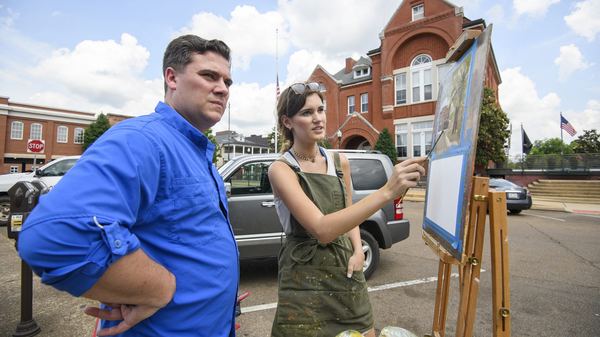 UM art professor Philip Jackson works with an Ole Miss student during a plein air class on the Oxford Square. Students are required to stage a show of their work before graduating with fine arts degrees, and resources are needed to improve lighting for their exhibitions. Photo by Thomas Graning/Ole Miss Digital Imaging Services