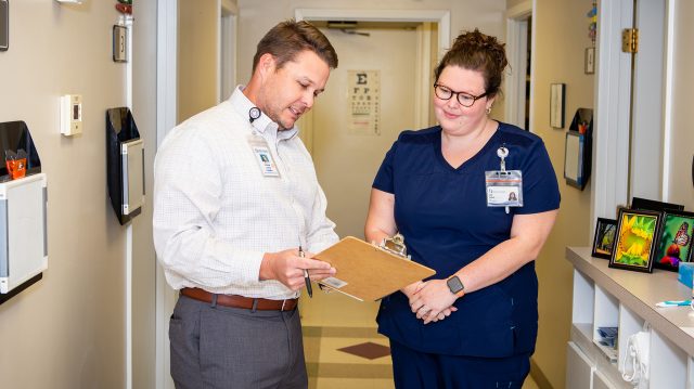 Pharmacy practice professor Adam Pate (left) reviews a chart at the NMHS New Albany Medical Clinic with pharmacy student Carlie Stanford, of Fulton. The partnership between the university and NMHS helps provide better health care for patients and provides opportunities for Ole Miss pharmacy students. Photo by Bill Dabney/ UM Foundation