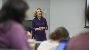 Students listen intently during Robin Street’s upper-level IMC 491 public relations class. Street, praised for her close relationships with her students, is retiring at the end of the spring semester. Photo by Thomas Graning/Ole Miss Digital Imaging Services
