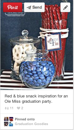 Red & Blue snacks – Red and blue foods double as party decor and snacks. Instead of sweets, you could also try blueberries and strawberries. (You did just eat a bunch of tiny chocolate mortar boards, after all.) The Ole Miss Tailgating Treats board has lots of edible red and blue inspiration.