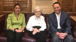 The late Cora Mitchell (center) and niece Pat Thomasson visit with Lee Cohen, dean of the UM College of Liberal Arts. Submitted photo