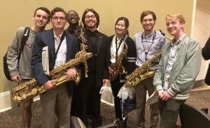 Archive Photo: Members of the Ole Miss Saxophone Studio, including junior Mayuka Ishii (center right), gather in Nutt Auditorium following a 2019 performance. Submitted photo