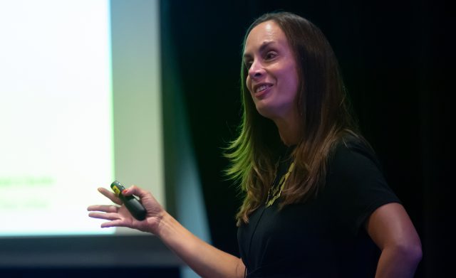 Nadine Gaab, associate professor in the Harvard University Graduate School of Education, speaks to attendees at the Understanding Early Literacy Conference at the Oxford Conference Center. The daylong event was sponsored by the North Mississippi Literacy Project, UM School of Applied Sciences, Mississippi Education Consortium, Shelton School and Lafayette County School District. Photo by Kevin Bain/Ole Miss Digital Imaging Services
