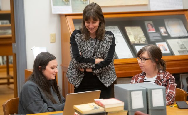 Eva Payne (center), UM associate professor of history, speaks with Madeline Burdine (left), a first-year graduate sociology and anthropology student, and Angie Rankin, a second-year sociology graduate student, about their display for the Queer Mississippi Exhibit in the Department of Archives and Special Collections in the J.D. Williams Library. The exhibit uses archival materials and quotes from the Queer Mississippi Oral History project to show the history of LGBTQ+ people in the state. Photo by Kevin Bain/Ole Miss Digital Imaging Services