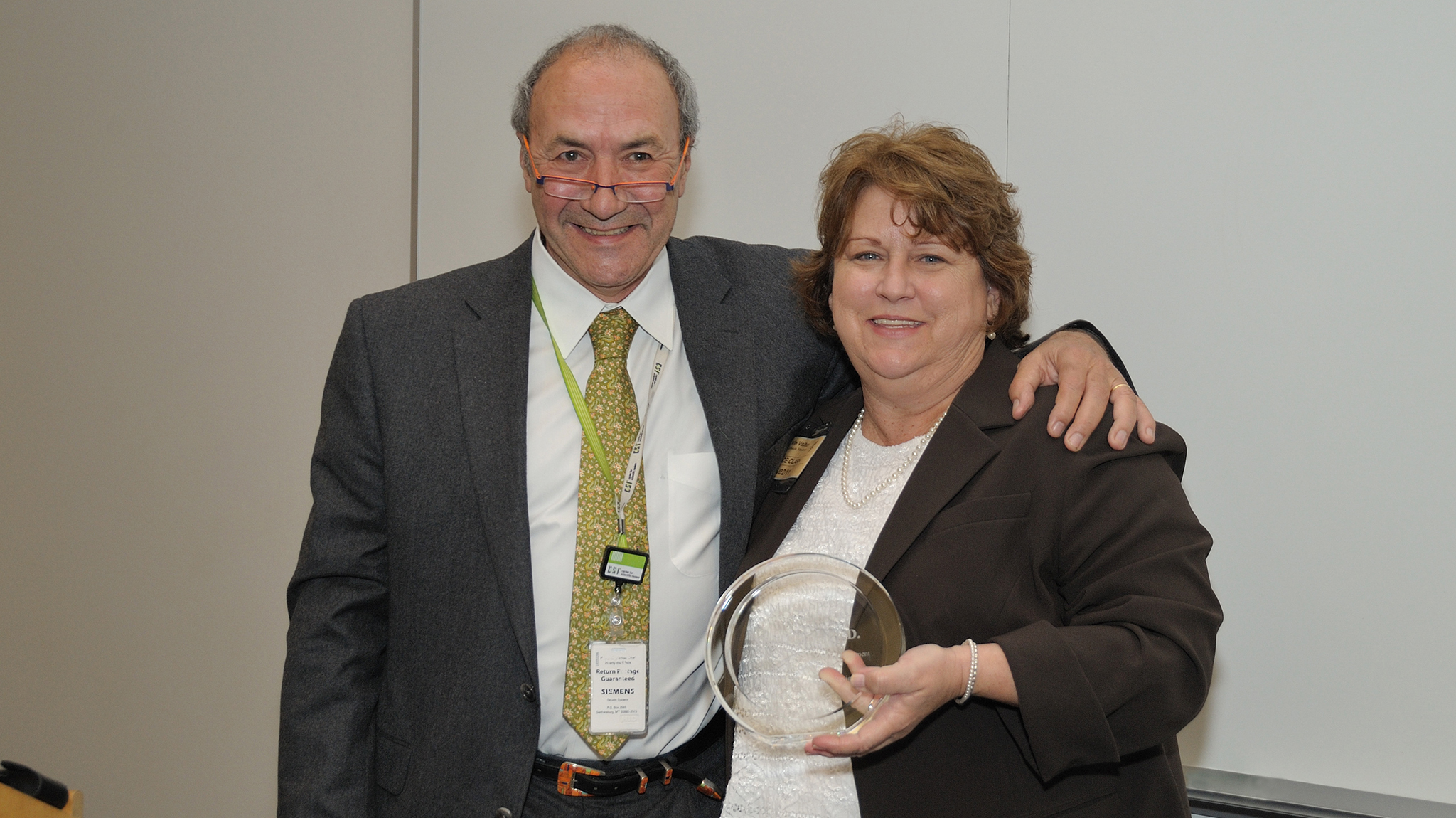 Toni Scarpa, director of NIH’s Center for Scientific Review, poses with Alice Clark after presenting her with the center’s 2010 Marcy Spear Outstanding Reviewer Award for her 20-year commitment to reviewing NIH grant proposals.