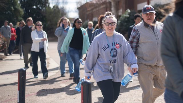 UM employees participate in a RebelWell event celebrating National Walking Day. Photo by Logan Kirkland/Ole Miss Digital Imaging Services