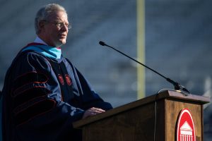 Chancellor Glenn Boyce speaks to the Class of 2021 during Convocation at the University of Mississippi’s 168th Commencement at Vaught-Hemingway Stadium on Saturday (May 1). Photo by Kevin Bain/Ole Miss Digital Imaging Services