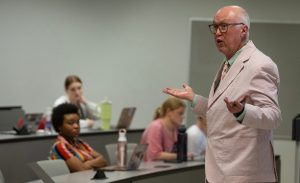 Journalism professor Mark Dolan (right) leads a class in Farley Hall. The university has enjoyed a surge in enrollments, setting a university and state record with 24,710 students this fall. Photo by Thomas Graning/Ole Miss Digital Imaging Services
