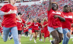 Thousands of new students participate in Rebel Run, an annual tradition of allowing new freshmen and transfer students run across the Vaught-Hemingway Stadium field during an Ole Miss home football game, this year against Georgia Tech. The university enrolled a state record of more than 5,200 freshmen this fall. Photo by Srijita Chattopadhyay/Ole Miss Digital Imaging Services