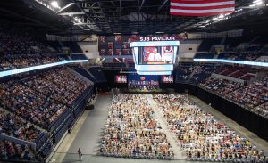 More than 5,000 freshmen gather in The Sandy and John Black Pavilion at Ole Miss in August for the university’s annual freshman convocation. Photo by Thomas Graning/Ole Miss Digital Imaging Services