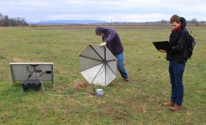 Brian Carpenter (left) and Hank Buchanan, two research and development engineers at the University of Mississippi’s National Center for Physical Acoustics, work on an infrasound array sensor at Alabama A&M University’s Winifred Thomas Agricultural Research Station north of Huntsville in 2020. Photo by Shea Stewart/UM Office of Research and Sponsored Programs