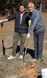 Farhan Mahmood Shah (left) and Abbas Ali collect sand at the UM Field Station that they will treat with natural compounds to test their repellency and toxicity against fire ants. Photo by Thomas Graning/Ole Miss Digital Imaging Services