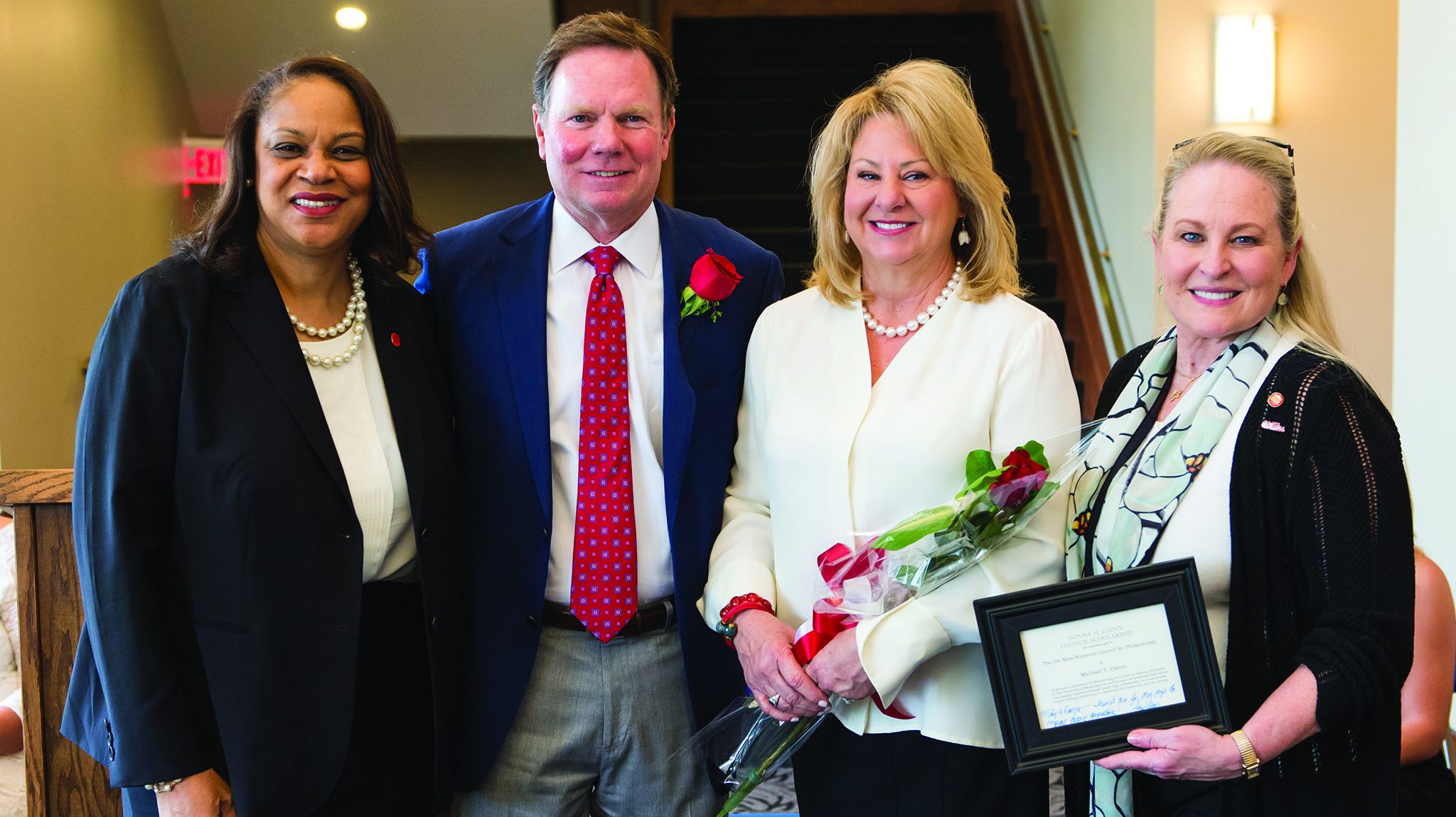 Rose Flenorl (left), Mike Glenn, Donna Glenn and Mary Haskell gather at the Ole Miss Women’s Council’s Rose Ceremony in 2017. Photo by Bill Dabney/UM Foundation