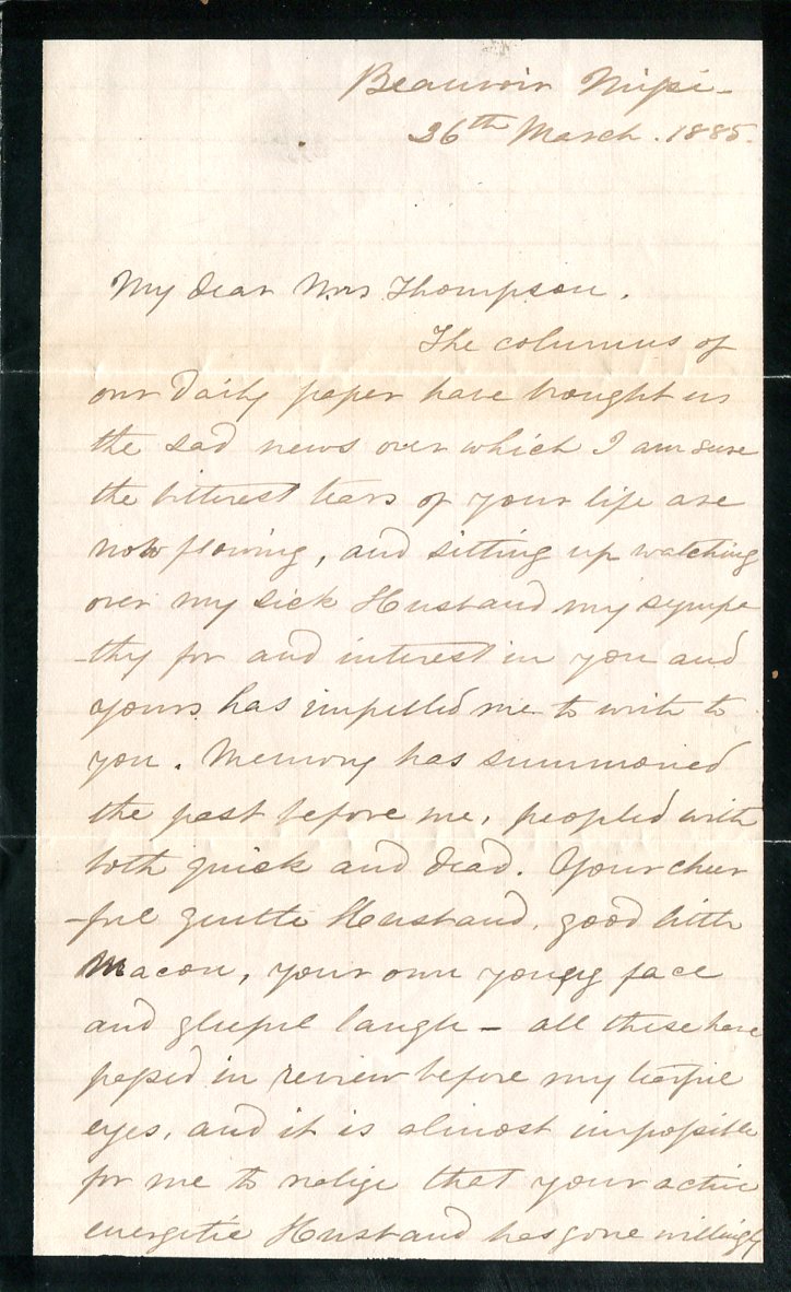 The Carolyn Jones Ross Memorial Collection began last March with an initial gift of primary documents from Jacob Thompson and his family. Included are nine letters signed by Thompson, 17 letters from his wife, Catherine, ledgers containing information on slaves and financial papers written between 1842-1885.