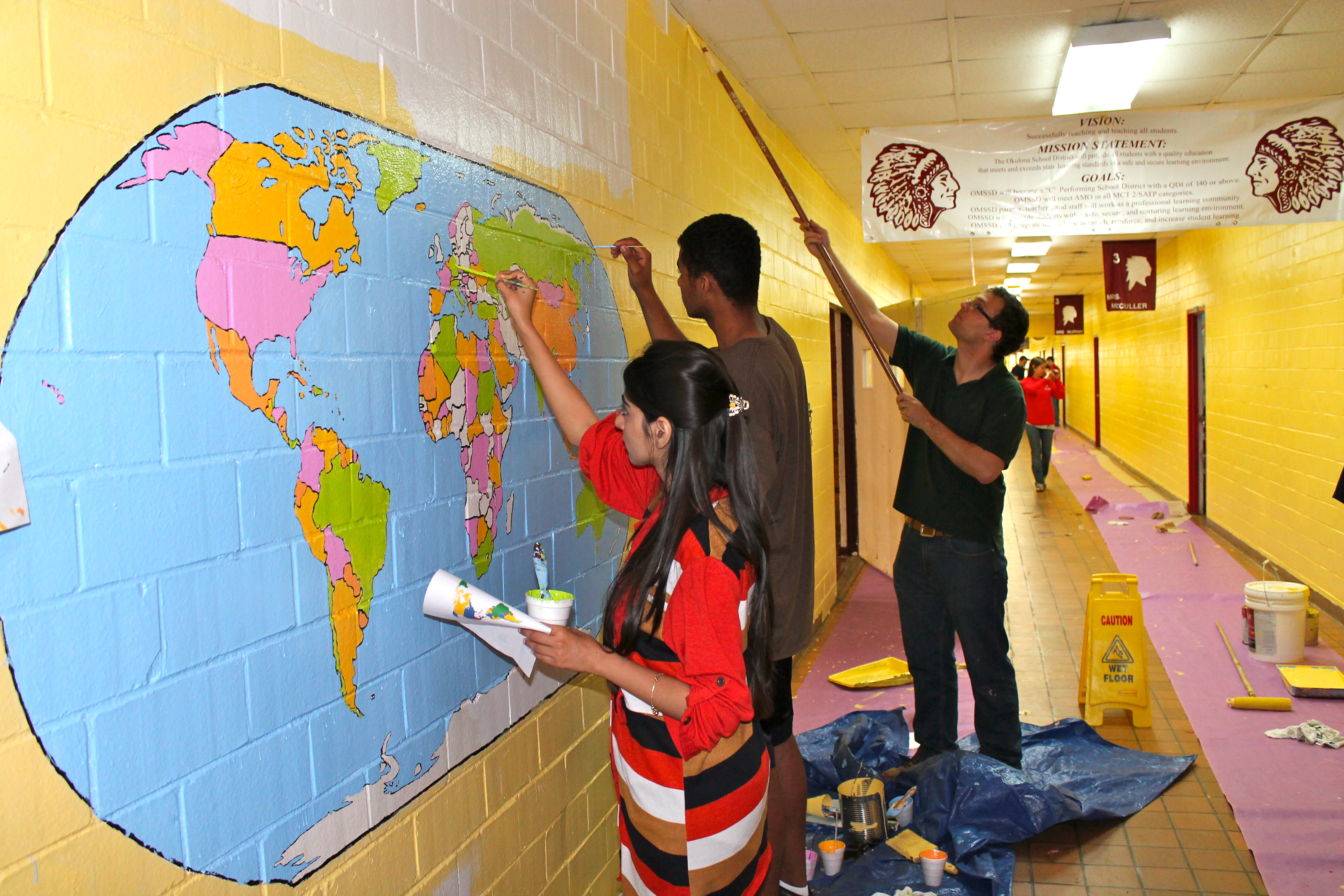 On Saturday, a group of about 50 volunteers, ranging from parents and a local school board member to the McLean Institute for Public Service and AmeriCorps VISTA program, repainted the hallway, doors and teacher’s lounge. Students from Rebel Global Connections even painted some pretty impressive murals in the hallway.