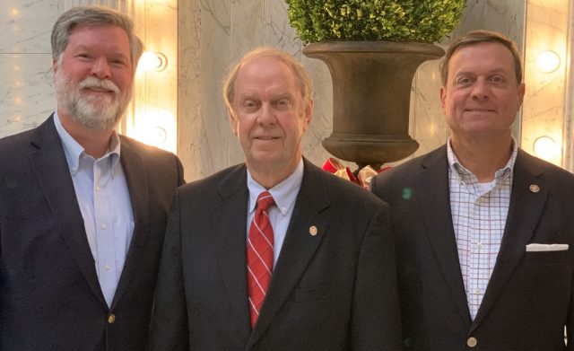 Ken Cyree (left), dean of the UM School of Business Administration, meets with Mississippi Insurance Commissioner Mike Chaney (center) and state Sen. Walter Michel, who have combined their resources to create a scholarship for seniors in the university’s risk management and insurance program. Submitted photo
