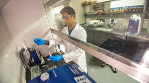 Abbas Ali, a principal scientist in the UM National Center for Natural Products Research, works to develop insect repellents from natural products, part of the School of Pharmacy’s efforts to fight malaria. Photo by Sydney Slotkin DuPriest/School of Pharmacy