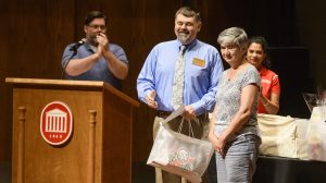 Kathy Tidwell (right), contractual services manager and director of university licensing, receives a standing ovation during annual Staff Appreciation Awards on Friday. Tidwell, who has worked at UM for 49 years, is recognized by Johnny Price (left) Staff Council president. Photo by Thomas Graning/Ole Miss Communications