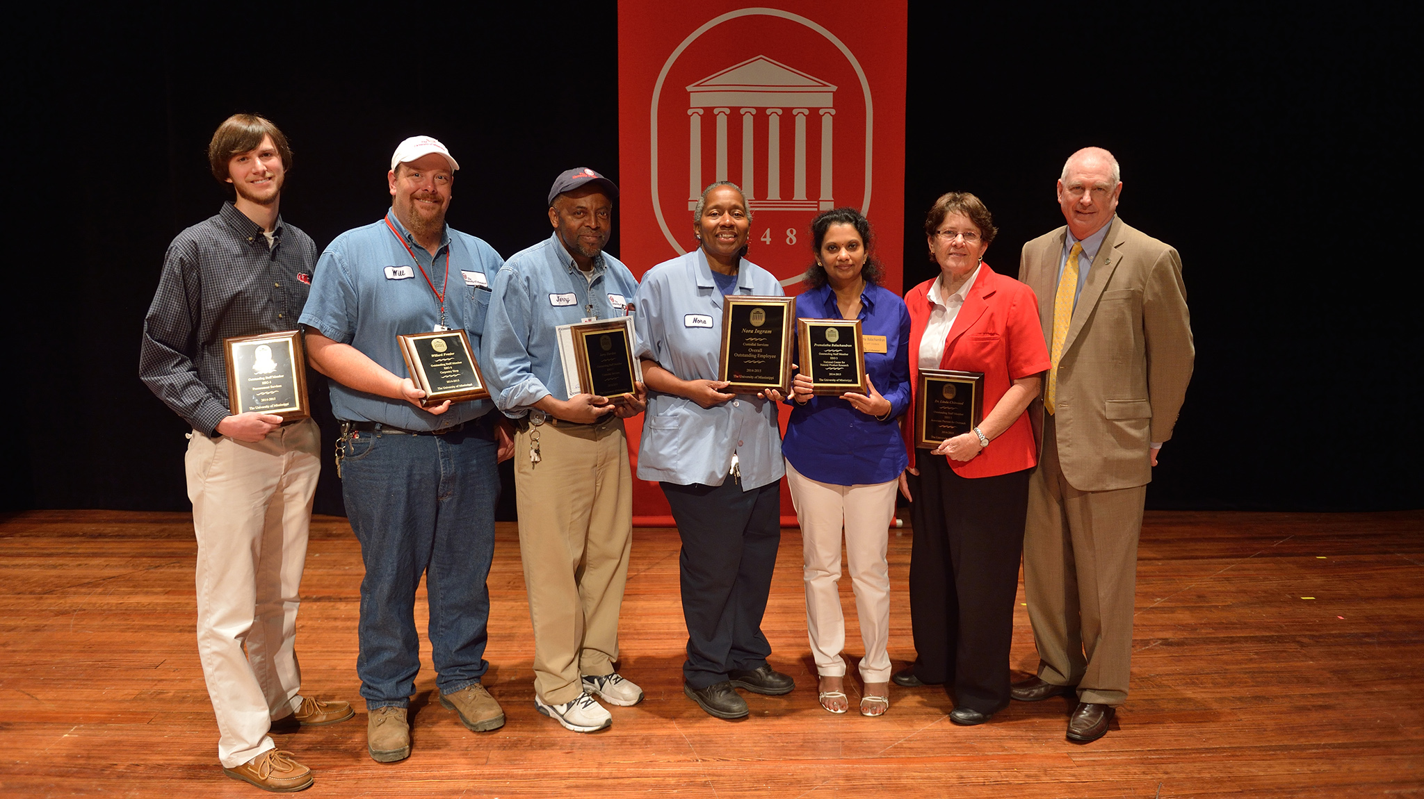 Six other employees were equally surprised to be presented Outstanding Service Awards, including a $500 stipend, in their respective EEO categories. Winners were Linda Chitwood, associate provost for outreach, for EEO 1 (Executive and Managerial); Prelmalatha Balachandran, research scientist in the National Center for Natural Products Research, for EEO 3 (Professional Non-faculty); Steven Rideout, procurement assistant in Procurement Services; for EEO 4 (Secretarial/Clerical); Jeffrey Hannah, performing arts technical coordinator in the Department of Theatre Arts, for EEO 5 (Technical/Paraprofessional); Willard Frazier, senior carpenter in the Carpentry Shop; for EEO 6 (Skilled Crafts) and Jerry Harden, senior custodian in Custodial Services; for EEO 7 (Service Maintenance).