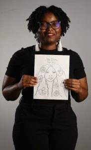 Kirstie Manning with a coloring book page she designed at Kirstie Manning, human resources assistant in the UM Department of Human Resources, used her staff creative residency to make a coloring book of hairstyles and headdresses. Photo by Bruce Newman Photography