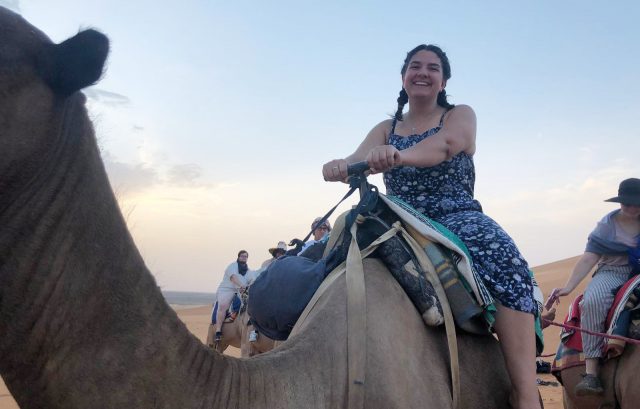 UM junior Isabel Spafford rides a camel in Morocco, where she spent her summer on an immersive experience of language and culture studies through the university’s Arabic Language Flagship Program. Submitted photo