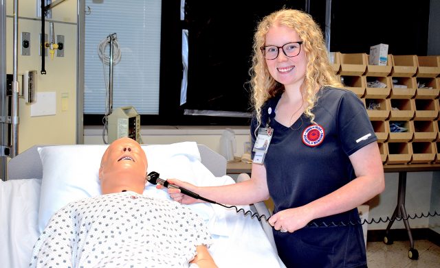Kaylee Hillhouse monitors a ‘patient’ in a clinical teaching lab at the UM South Oxford Center. She recently graduated with bachelor’s degrees in nursing and allied health studies and begins her career as an ICU nurse this month at Baptist Memorial Hospital-North Mississippi. Photo by Pam Starling/Division of Outreach and Continuing Education