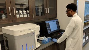 Larry Stokes, a former undergraduate member of the Interdisciplinary NanoBioSciences Lab at the University of Mississippi, runs a flow cytometry analysis on cells being used in the lab. Submitted photo