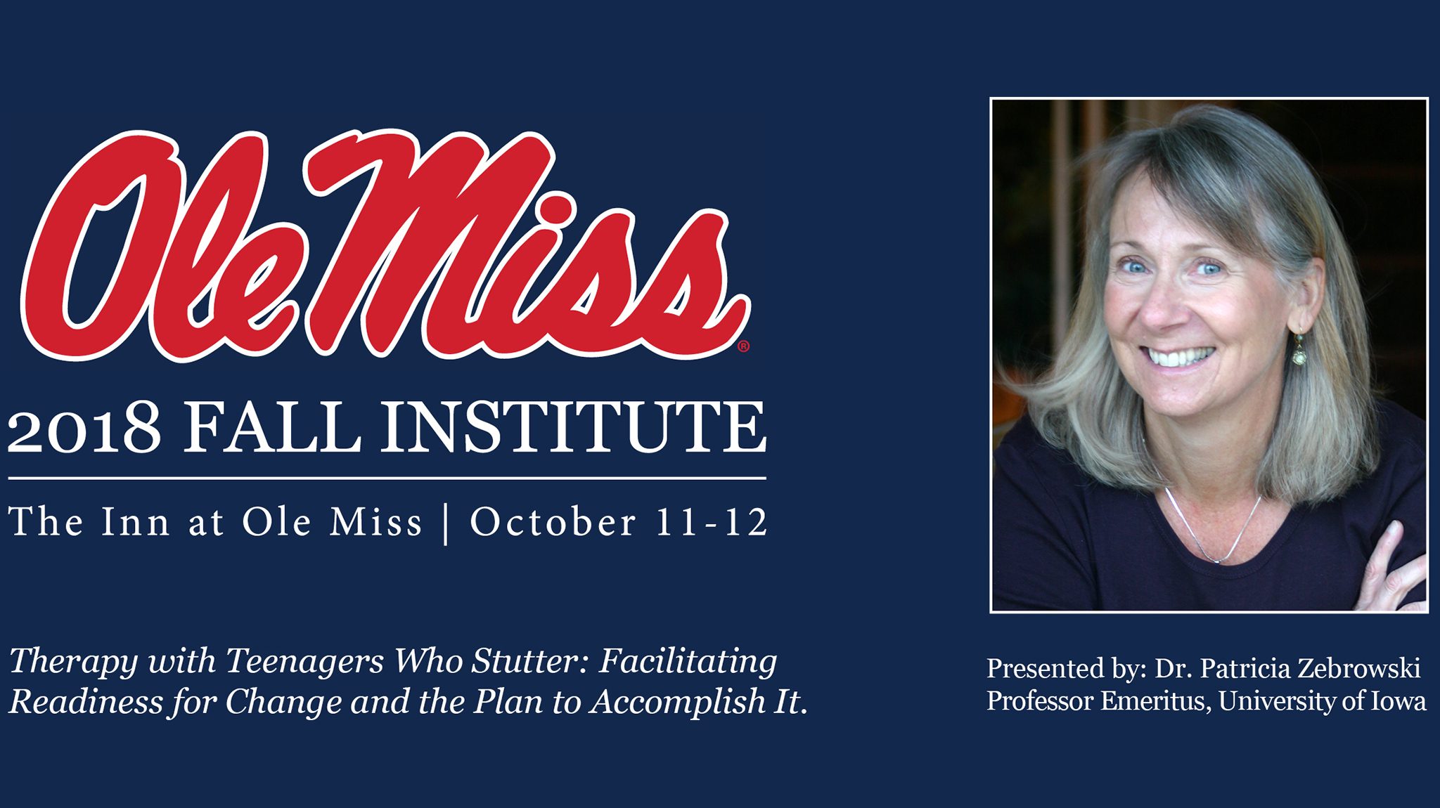 Patricia Zebrowski, former director of the Stuttering Research Lab at the University of Iowa and professor emeritus in the university’s Department of Communication Sciences and Disorders, will address best practices for clinicians working with older adolescents who stutter in “Therapy with Teenagers Who Stutter: Facilitating Readiness for Change and the Plan to Accomplish It,” the keynote for the Ole Miss Fall Institute. The institute runs Thursday and Friday (Oct. 11-12) at The Inn at Ole Miss.