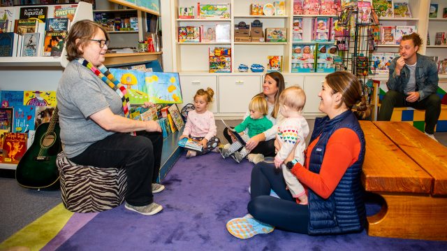 Jilleen Moore (left) leads story time at Square Books Jr. in Oxford with Juniper Dutson, Benjamin and Michele Ard, Anne Carter and Sarah Abraham, and Dylan Dutson. Just like story time, the Children’s Book Festival at the university encourages a love of reading, and the festival has received major support from the family of the late Elaine Hoffman Scott of Little Rock, Arkansas. Photo by Bill Dabney/UM Foundation