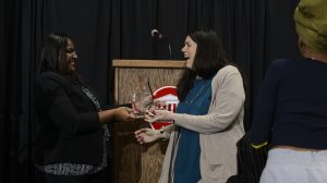 Lindsey Bartlett Mosvick (right), assistant director for violence prevention at the University Counseling Center, receives the Women’s Inspirational Award from Shawnboda Mead, director of the Center for Inclusion and Cross Cultural Engagement. Photo by Marlee Crawford/Ole Miss Communications