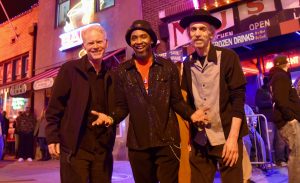 UM professors Adam Gussow (left) and Alan Gross (right), and bandmate Rod Patterson hang out on Beale Street in Memphis. Submitted photo