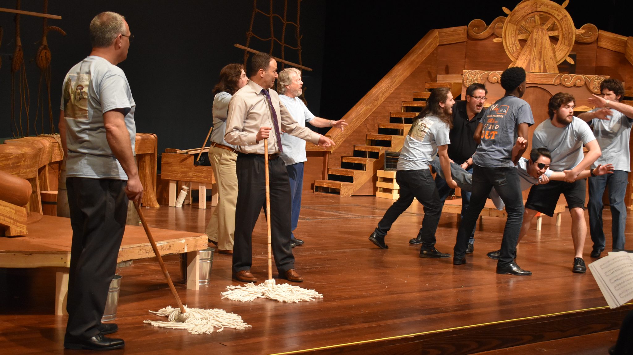 UM Interim Chancellor Larry Sparks (left) and liberal arts Dean Lee Cohen look on as their fellow sailors prepare to launch a mate overboard in rehearsals for the Opera Theatre production of ‘H.M.S. Pinafore,’ which runs this weekend at the Gertrude C. Ford Center for the Performing Arts. Photo by Lynn Wilkins/Department of Music