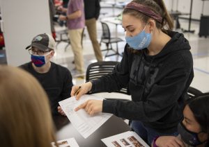 UM sophomores Maren McSparin (standing), a chemical engineering major from Edwardsville, Illinois; Andrew Duffield (left), of Murfreesboro, Tennessee; and Francesna Patawaran, of Tupelo, review the takt time for a toy car assembly process in the Haley Barbour Center for Manufacturing Excellence during a Winter Intersession class led by Toyota Production System group leaders. Photo by Logan Kirkland/Ole Miss Digital Imaging Services