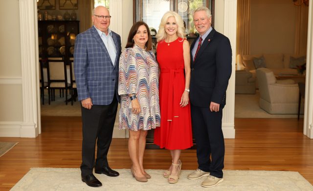 Chuck (left) and Lisa Nicholson visit with Emily Boyce and Chancellor Glenn Boyce before a campus luncheon, where Lisa Nicholson learned her husband had created a School of Education scholarship endowment in her name. The scholarship will assist Mississippi Excellence in Teaching Program participants. Photo by Kirsten Simpson/University Development