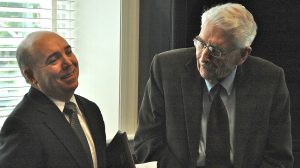 Greg Brock (left), UM alumnus and senior editor for standards at The New York Times, shares a laugh with Jere Hoar, retired journalism professor, at an event at the School of Journalism and New Media. Submitted photo