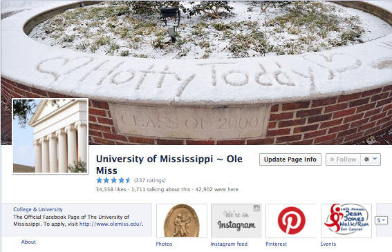 The University of Mississippi Facebook page has been ranked the second most engaging college/university Facebook page of its size (between 25,000 – 74,999 ‘Likes’) by VarsityOutreach.com. Varsity Outreach is a third-party website that publishes ‘The Social Side of Admissions,’ a four-part yearly blog series that provides analysis of how colleges and universities are utilizing Facebook. Within the series, Varsity Outreach ranks college and university Facebook pages by their respective engagement score, or, how active their audience is on their respective pages.