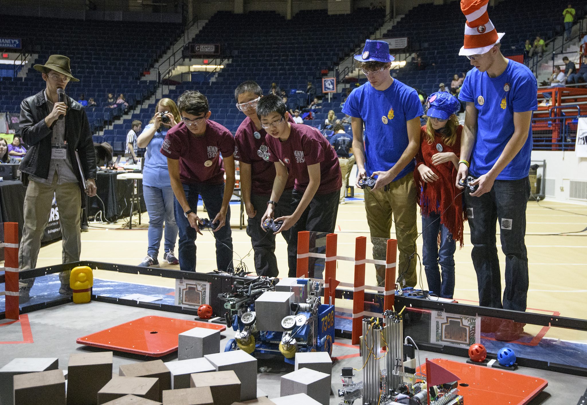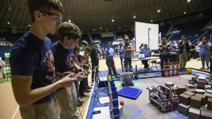 Student teams face off against each other during the annual FIRST Tech Challenge robotics competition at the University of Mississippi. The 2020 competition is set for Feb. 28-29, with Saturday’s rounds open to the public 10 a.m.-5 p.m. in Tad Smith Coliseum. Photo by Thomas Graning/Ole Miss Digital Imaging Services