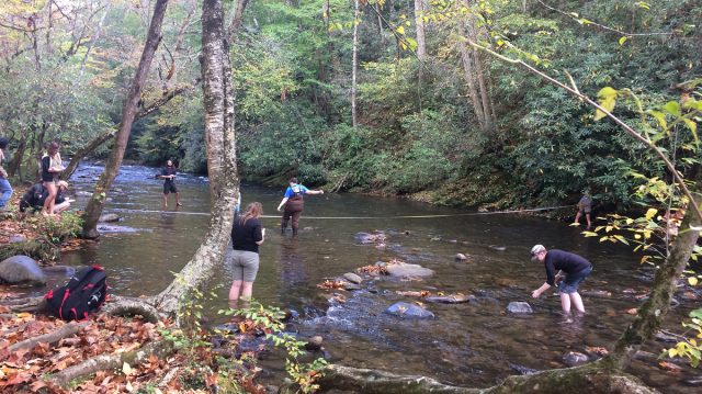 Middle Tennessee State University students in a geosciences hydrogeology course conduct stream morphometric analysis in a Great Smoky Mountains National Park stream. Assistant professor Racha El Kadiri received a grant from the U.S. Department of Agriculture to partner with the University of Mississippi to study the role and potential effects of climate change on conservation practices and 21st century agricultural challenges. Photo courtesy Racha El Kadiri/MTSU