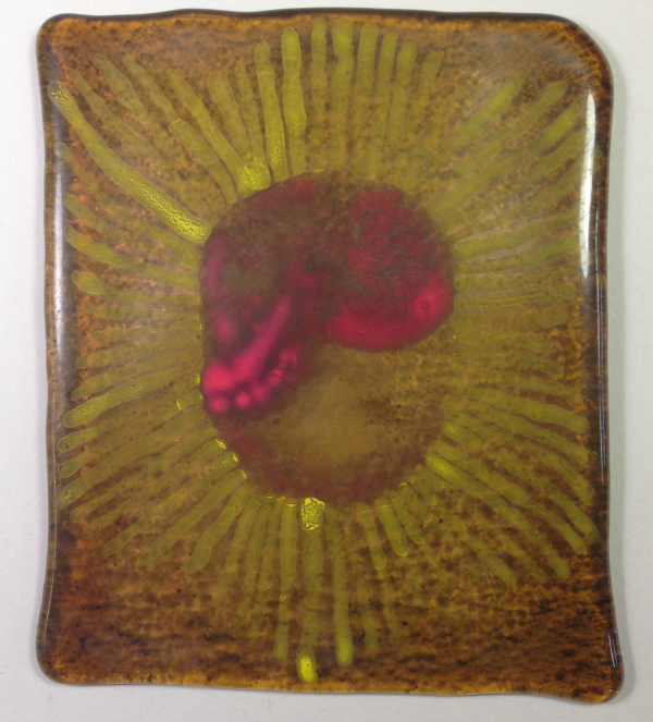 Today’s featured item is Theora Hamblett‘s painting on glass titled “Creator’s Star and Trinity.” Hamblett donated the piece, which features a six-pointed start with 63 yellow rays radiating from a golden-red center, to the museum. The paint is between two layers of glass.