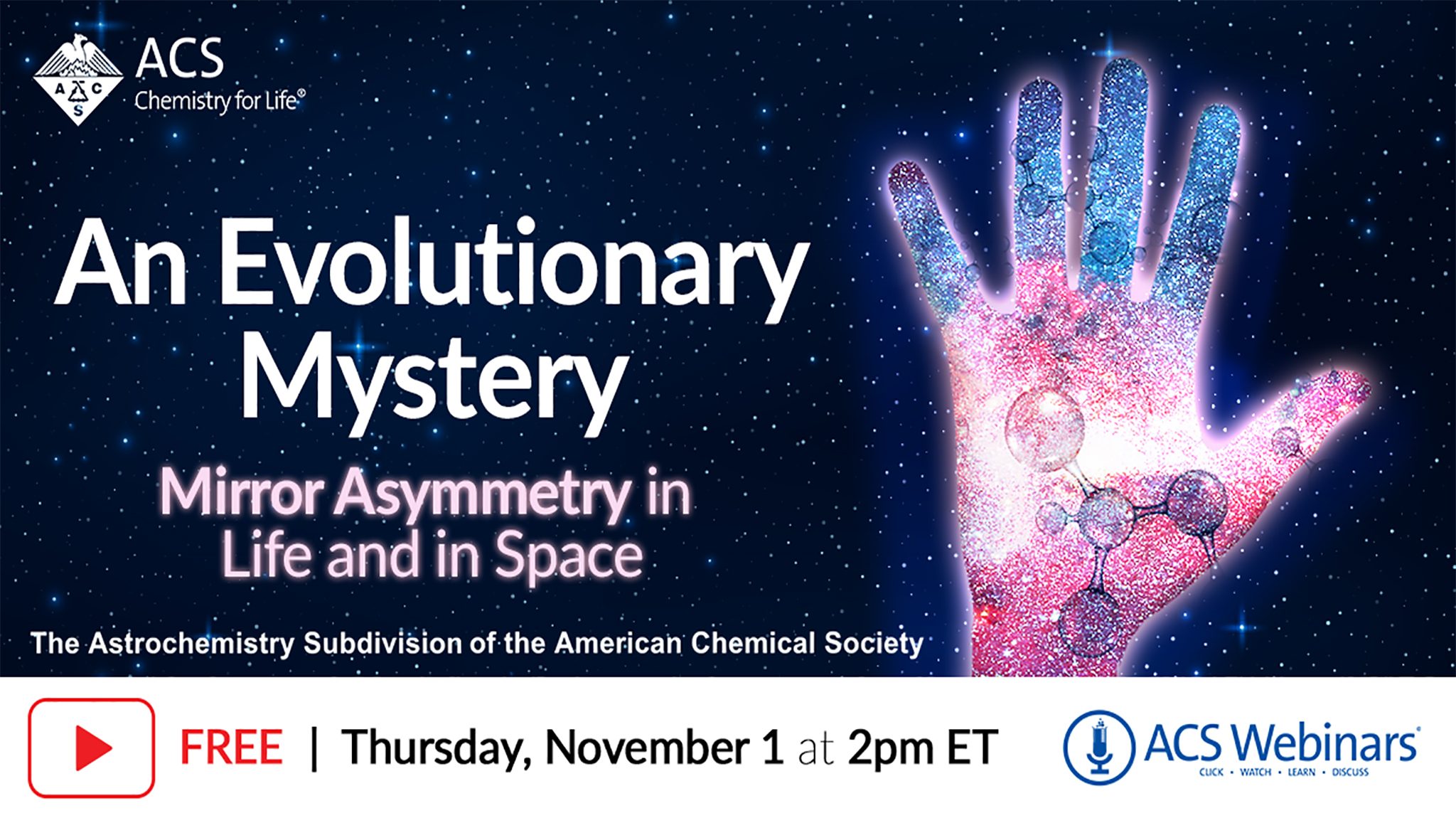 The webinar will explore this question along with the impact of homochirality on biology and chemical evolution, the potential origins of homochirality and the challenges in studying possible interstellar origins, and the first detection of a chiral interstellar molecule and challenges associated with measuring a potential chiral excess in space.