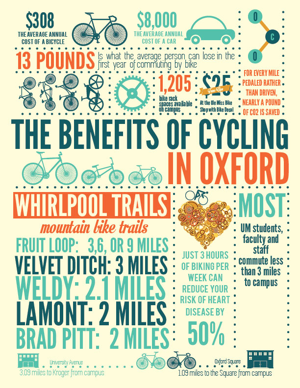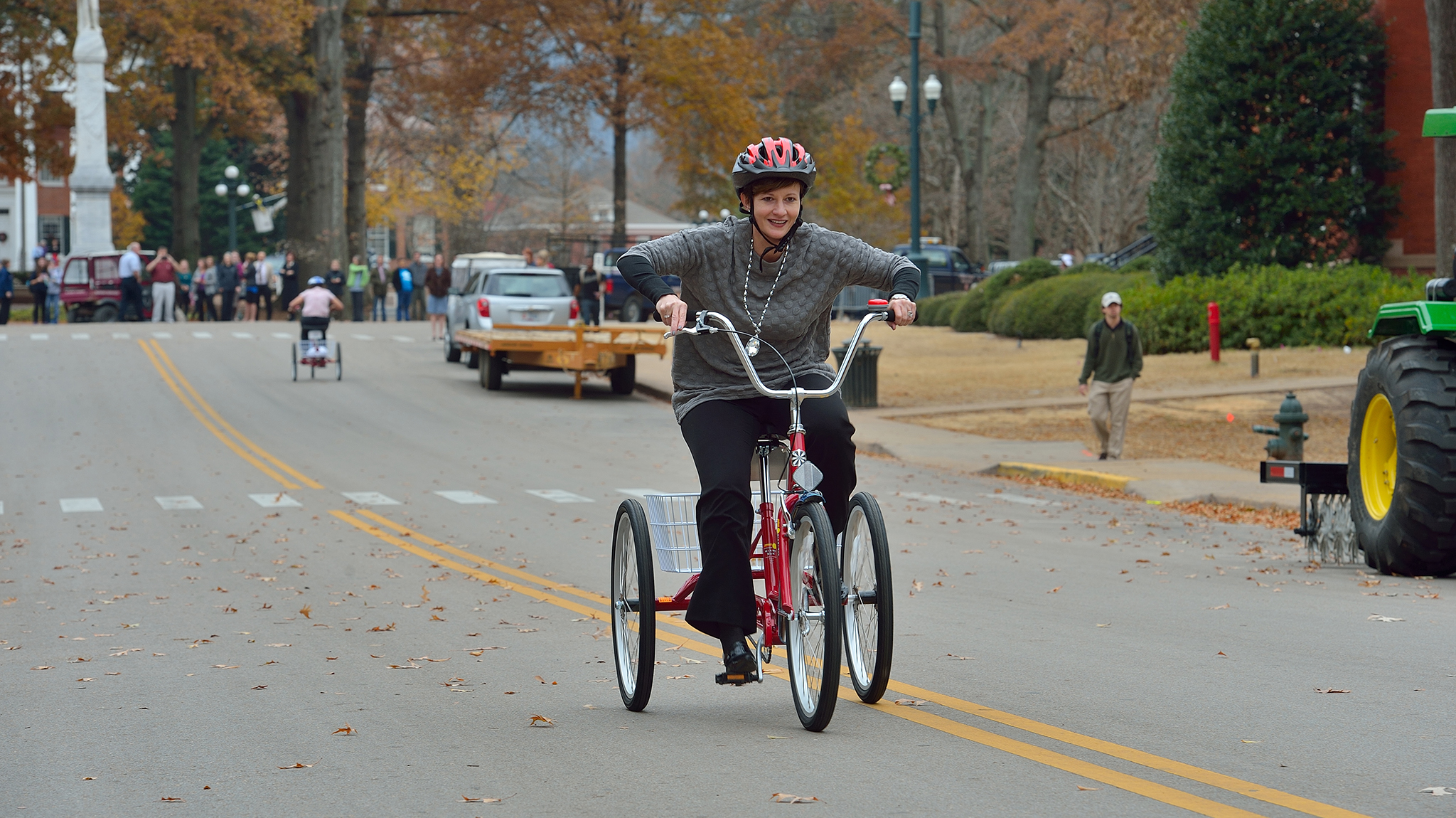 Using a portion of a $250,000 grant from the Blue Cross Blue Shield of Mississippi Foundation, the university purchased a fleet of 25 bikes and 15 trikes for faculty and staff use. Some 50 more bikes for student use were purchased by UM Parking and Transportation. Another 100 bikes are available for rent.