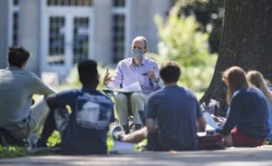 A professor conducts class outside on the Oxford campus to adhere to COVID-19 protocols and procedures. Photo by Logan Kirkland/Ole Miss Digital Imaging Services