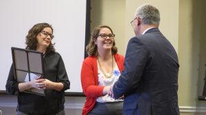 Erin Oeth (left), project manager with the UM Division of Diversity and Community Engagement, and Interim Chancellor Larry Sparks (right) congratulate Anne Cafer on winning an Algernon Sydney Sullivan Award at the 2019 Celebration of Service. Cafer, an assistant professor of sociology and coordinator for the Applied Policy and Community Research Institute, was honored for her research and her work with students. Photo by Thomas Graning/Ole Miss Digital Imaging Services