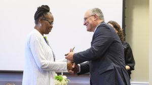 Interim UM Chancellor Larry Sparks presents an Algernon Sydney Sullivan Award to Karen T. Peairs, assistant director for career services in the UM School of Law, during the 2019 Celebration of Service. Through her work at the law school and community and state legal organizations, Peairs has worked to address the unmet legal needs that plague the state of Mississippi. Photo by Thomas Graning/Ole Miss Digital Imaging Services