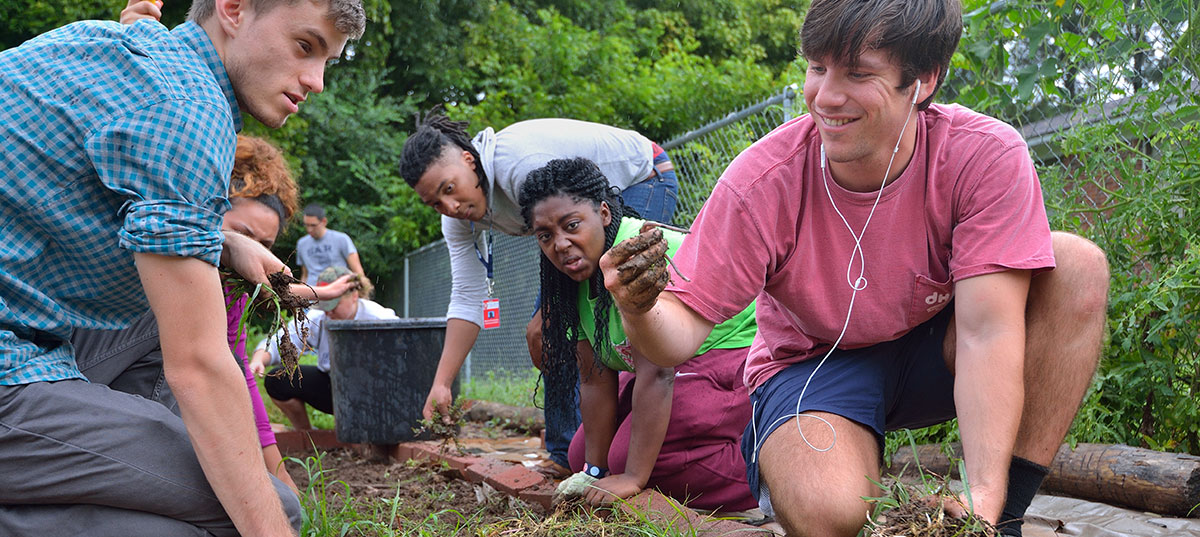 UM Student Housing Day of Service volunteer Giovanni Lavermicocca Ciccone examines a large earthworm he unearthed while weeding in the Oxford Boys and Girls Club garden. Photo by Robert Jordan/Ole Miss Communications