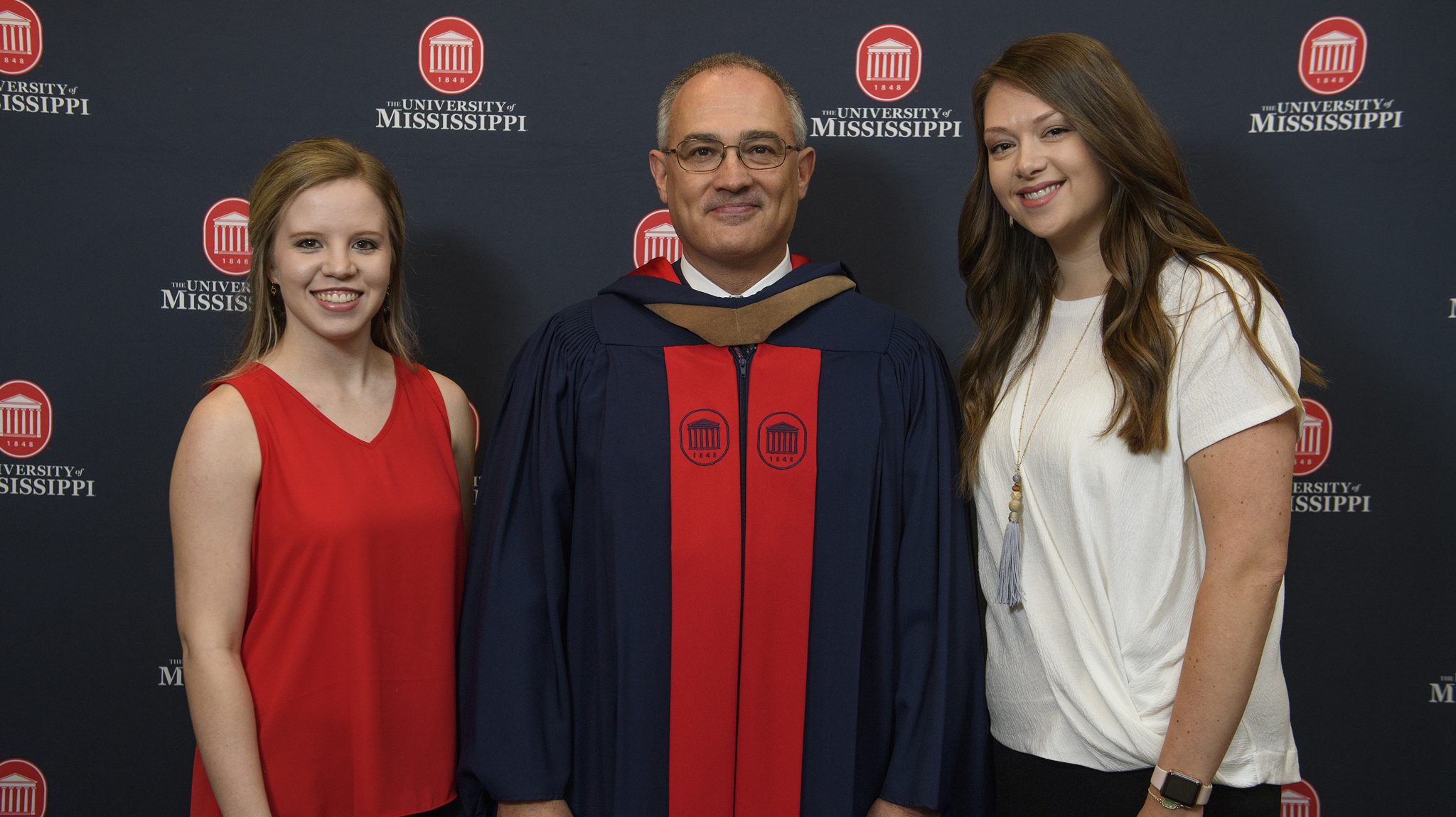 UM-Tupelo students Alexandria Sappington (left), of Pontotoc, and Madison Hawes, of Saltillo, are honored by Interim Chancellor Larry Sparks during an awards dinner earlier this month on the Oxford campus. Sappington and Hawes are among students receiving Marcus Elvis Taylor Medals for academic achievement, the university’s highest academic honor. Photo by Thomas Graning/Ole Miss Digital Imaging Services