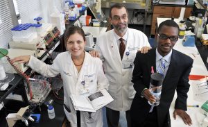 Rockhold (center) spends time in the lab with Base Pair alumni Dr. Kathryn Schneider (left) and Justin Porter. Schneider is an associate professor of pediatrics and assistant dean for medical school admissions at UMMC; Porter works in intellectual property and public policy. Photo courtesy UMMC