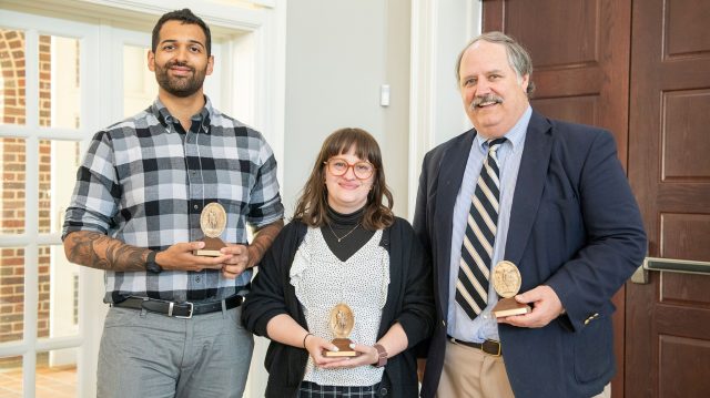 Recipients of the Sydney Algernon Sullivan Awards include Elijah Phoenix Murdryk (left), a doctoral student in the clinical psychology program from Vancouver, British Columbia; Jessica Gabrielle Evans, recruiting coordinator in career services at the School of Law; and Ronald J. Rychlak, distinguished professor of law, Jamie L. Whitten Chair of Law and Government, and faculty athletics representative. Photo by Sri Chattopadhyay/Ole Miss Digital Imaging Services
