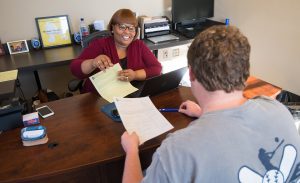 Jackie Certion (left) counsels a student in her office. Photo by Kevin Bain/Ole Miss Digital Imaging Services