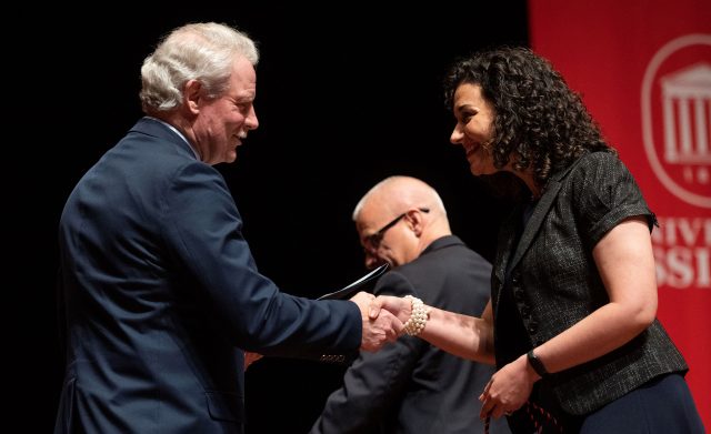 Chancellor Glenn Boyce (left) congratulates Melissa King, program manager in the School of Pharmacy, on Wednesday (May 10) at the annual Red and Blue Celebration of Achievement for earning her master’s degree in higher education. Photo by Thomas Graning/Ole Miss Digital Imaging Services